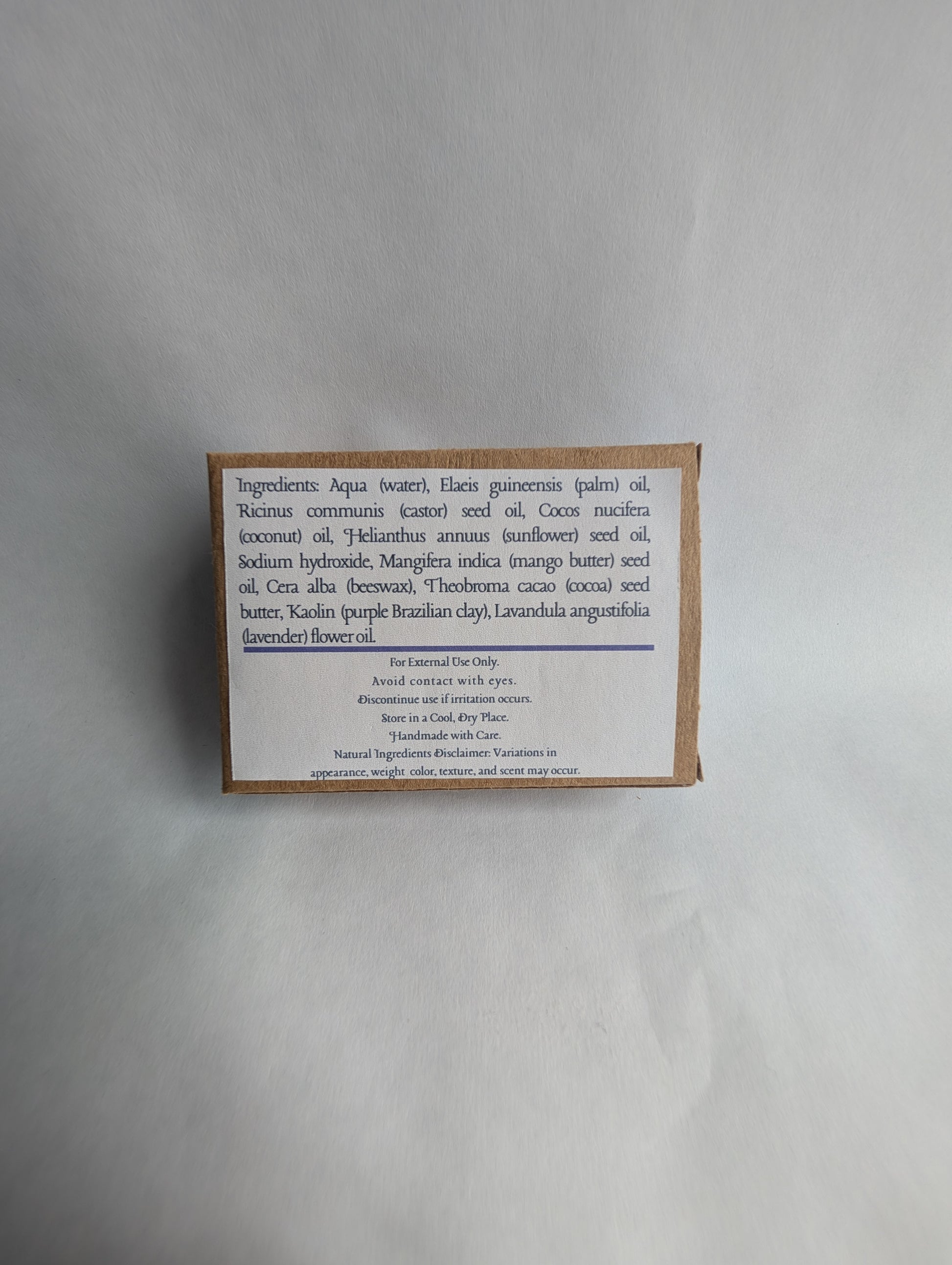 Ingredients: Water, Palm Oil, Castor Oil, Coconut Oil, Sunflower Oil, Lye, Mango Seed Butter, Beeswax, Cocoa Butter, and Lavender Essential Oil.